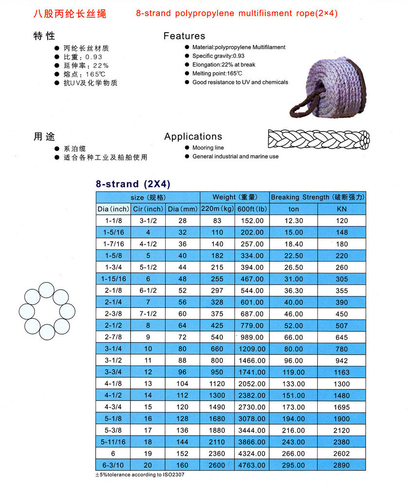 丙綸長絲學名聚丙烯纖維,它是由丙烯作原料經聚合、熔體紡絲製得的纖維,丙綸長(複)絲纜繩強度高,相對密度輕等優點丙綸長(複)絲繩索手感光滑柔軟。丙綸絲降低了繩子的比重,使得繩子可以浮於水面。引進德國技術,其產品編織結構合理、工藝科學、具有高強力、低伸長、耐磨損、操作簡便等優點.主要用於各類船舶配備,漁業捕撈、港口裝卸、電力施工、石油勘探、體育用品、國防科學研究等領域。