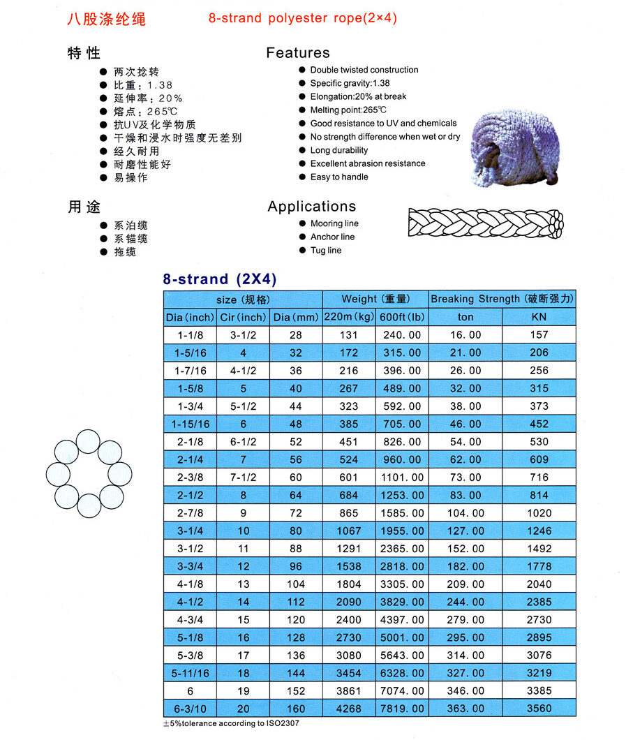 八股聚酯繩 八股聚酯繩採用高強度聚酯絲製作而成, 其具有很好的耐磨損、耐紫外線,抗腐蝕性能,強力高於丙綸繩。聚酯繩幾乎不吸水,所以無論乾濕它的強力都保持的比較穩定。由於聚酯纖維具有很高的耐高溫性,所以聚酯繩比較適合用於溫度較高的環境。設計人性化,操作順手,容易拼接。