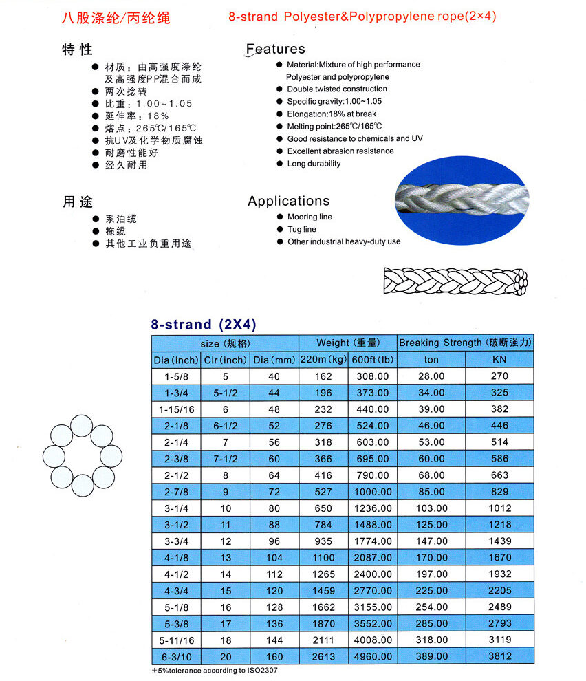 聚酯混合繩是由高強度聚酯絲和高強度丙綸絲混合製成的。聚酯纖維的耐高溫性能和高熔點使得繩子具備極佳的耐磨性和防靜電能力;丙綸絲降低了繩子的比重,使得繩子可以浮於水面。引進德國技術,其產品編織結構合理、工藝科學、具有高強力、低伸長、耐磨損、操作簡便等優點.主要用於各類船舶配備,漁業捕撈、港口裝卸、電力施工、石油勘探、體育用品、國防科學研究等領域。 在結構上,滌丙混合纜繩可以做成八股或十二股,也可以依需求做成3股,6股,24股,48股等雙編結構,用途非常廣泛,性價比極高。